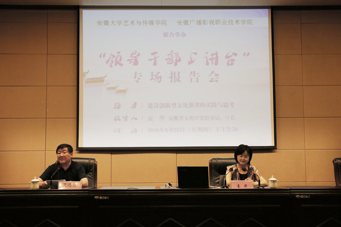 6月23日下午,由安徽大学艺术与传媒学院和安徽广播影视职业技术学院联合举办的“领导干部上讲台”专场报告会在学术报告厅举行。应学院邀请,省文化厅党组书记、厅长袁华为两校师生作了题为《建设创新型文化强省的实践与思考》的专场报告。学院党委书记、院长周之虎主持报告会,党委副书记沈端良,副院长张晶,副书记、副院长徐振轩出席报告会。