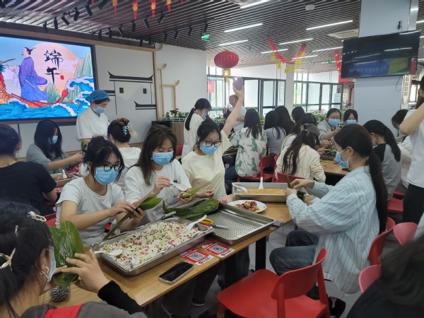 “先将粽叶卷成漏斗状,注意留出三分之一的叶尖……”食堂大厨化身“非遗导师”,手持粽叶现场演示。手指翻转间,一枚棱角分明的粽子便成型。同学们分组围坐,纷纷化身“包粽学徒”,有的发挥艺术创意,用彩线为粽子编织“个性外衣”;有的一边细心观察一边认真学习捆扎粽绳;有的成为“沉浸式体验派”为自己的粽子赋予“文化人设”。
