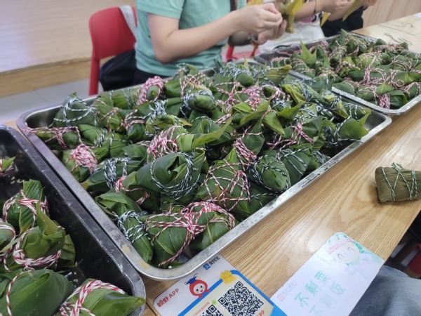 过程中不乏趣味插曲:新手们因粽叶折叠不当导致“露馅事故”;有人别出心裁地用粽叶编出小船造型,赢得喝彩。短短两小时,形态各异的粽子铺满操作台,既有传统四角粽的稳重大方,也有“迷你粽”“卡通粽”的创新巧思,成为传统文化与青春创意碰撞的生动注脚。