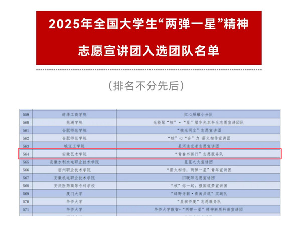 近日,由共青团中央青年志愿者行动指导中心与中国核工业集团有限公司联合开展的2025年全国大学生“两弹一星“精神志愿宣讲活动发布了入选团队名单,美术学院“青春书画行”志愿服务队成功入选。该项目全国共有1123所高校的5680支团队参与,其中1500支团队入选。
