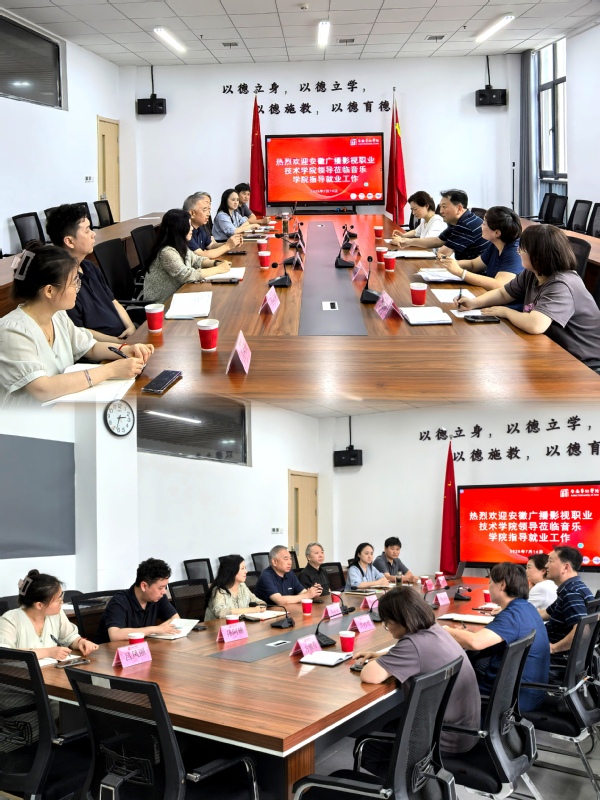 7月14日下午,安徽广播影视职业技术学院党委委员、副院长朱小龙一行来访我校,就音乐学院2025届毕业生就业数据核查等相关工作调研交流。校党委副书记陈文兵陪同并出席座谈会。