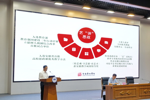 发言中,尹广富介绍安徽艺术学院落实立德树人根本任务,连续5年打造“讲道理也讲故事、有意义也有意思”的“艺‘讲’思政”育人品牌。他指出,安徽艺术学院每年突出一个国家层面重大主题,创新推动习近平新时代中国特色社会主义思想进课堂、进头脑、进教材,以艺术之美滋养时代新人,成功入选教育部教育强国建设三年行动计划立德树人机制综合改革首批试点院系,获得安徽教学成果特等奖,先后被新华社、《光明日报》《中国教育报》等主流媒体报道600余次。