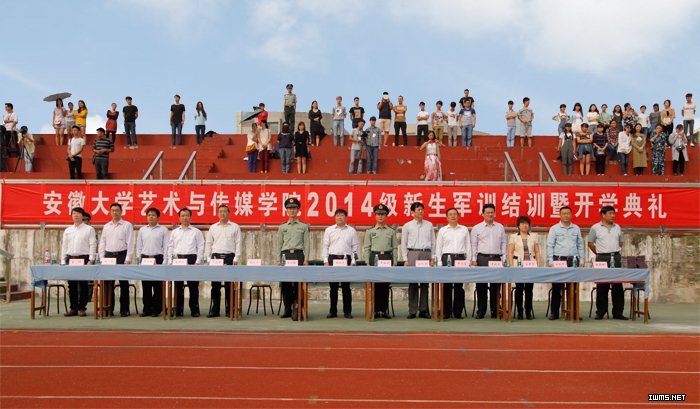 荷花映日笑迎八方学子,丹桂飘香共祝美好未来。9月28日上午,安徽大学艺术与传媒学院2014级新生军训结训暨开学典礼在体育运动场隆重举行。学院领导周之虎、赵枞安、胡献平,解放军电子工程学院二系主任申桂林,学院各系部、各部门主要负责人在主席台就座。各系教务秘书、学生管理秘书,全体班主任及2014级新生参加了此次典礼。典礼由副院长胡献平主持。