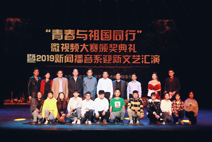 为庆祝中华人民共和国成立70周年,深入学习宣传贯彻习近平新时代中国特色社会主义思想,加强改进大学生思想政治教育,繁荣校园文化,弘扬和培育当代大学生爱国主义精神,11月1号下午,由学院党委主办、新闻播音系党总支承办的“青春与祖国同行”校园微视频大赛颁奖典礼暨2019新闻播音系“闻窗·艺·如初见”迎新文艺汇演在戏剧楼小剧场举行。学院党政领导班子成员,各行政、系部负责人出席此次活动,并为微视频大赛获奖作品颁奖。