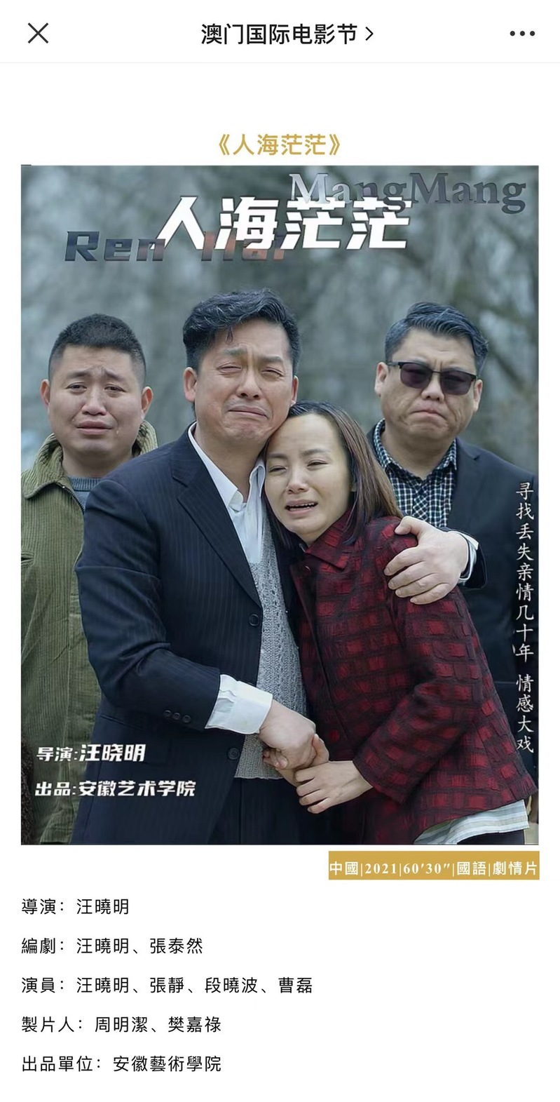 另悉,《人海茫茫》电影已申报参赛澳门国际电影节。 (撰稿:王璐侣摄影:汪晓明初核:汪晓明审定:束舒娅)