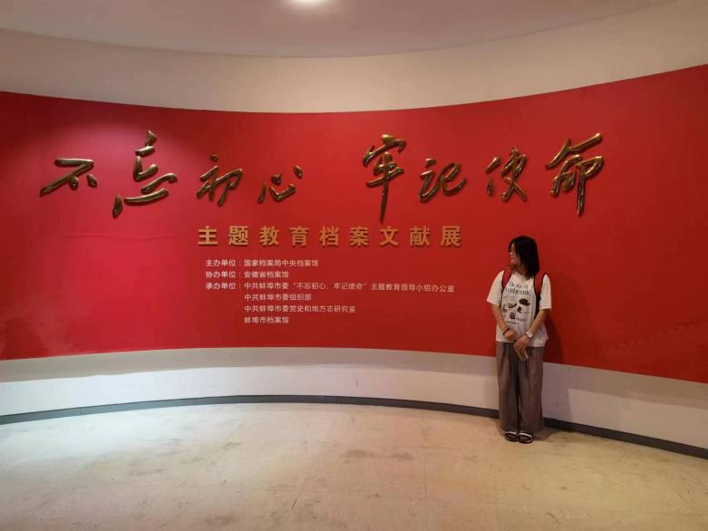 周一前往参观蚌埠档案馆。她谈到档案馆有许多关于党史和党员的事迹的资料。这些资料让她深刻地认识到党的奋斗历程和先辈们的艰辛努力,并且意识到自己作为一名党员要不忘党的宗旨,从自觉到自发,将爱国情转化为实践行,为身边人身边事多做奉献。