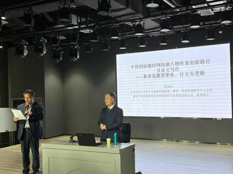 张智华从刑侦类网络剧人物形象的网感特质、人物形象与审美构建的创新路径、人物形象与审美构建的内在逻辑三个方面展开讲述,结合《白夜追凶》《无证之罪》等网络热剧,深入浅出地为师生们介绍了中国刑侦类网络剧的发展方向,并指出网络剧人物创新要有原型参照。