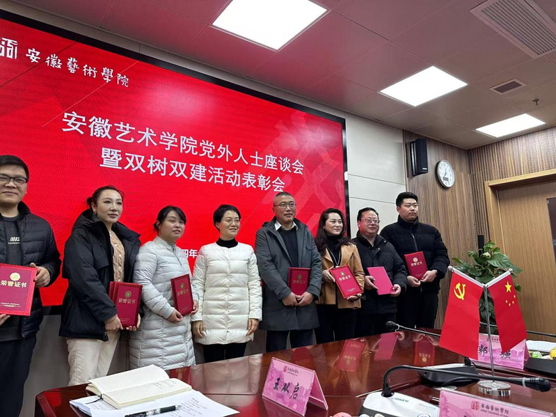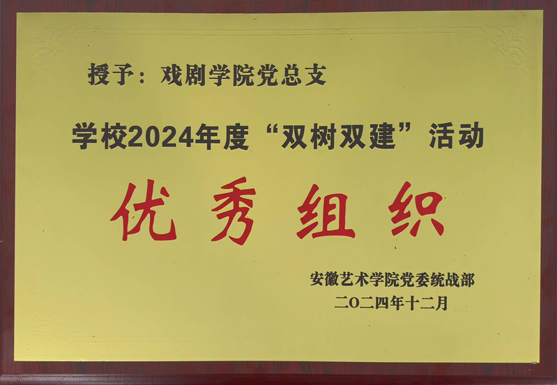 在安徽艺术学院党外人士座谈会暨双树双建表彰会上,戏剧学院党总支荣获学校2024年度“双树双建”活动“优秀组织”荣誉称号,茆建琳、邹荣学、孙禹三位老师获得“双树双建年度标兵”荣誉称号。