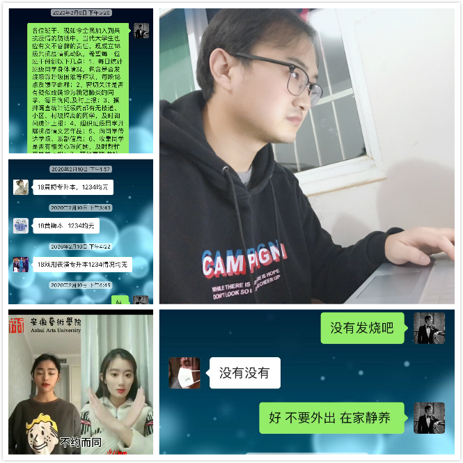 自防疫阻击战打响以来,戏剧影视系高度重视疫情防控工作,严格按照学院党委要求和系党总支部署,在这场全民阻击战中发挥文艺专长,向学生宣传防疫新闻、普及防疫知识,把疫情防控作为当前头等重要的工作来抓。而在学生工作一线的戏剧影视系辅导员郑军,也本着对自己、对学生、对社会负责的态度,以实际行动响应政府号召,第一时间科学全面研判疫情态势,迅速部署落实各项措施,全力以赴做好一切防控工作。