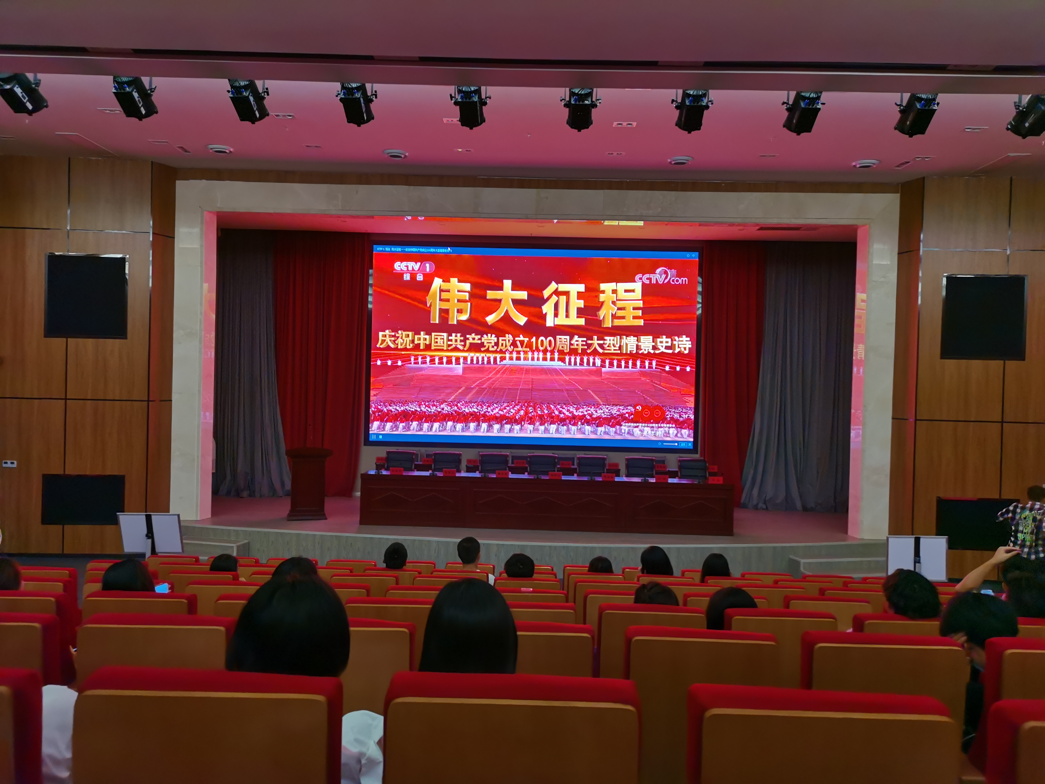 7月1日晚8时,庆祝中国共产党成立100周年大型文艺演出《伟大征程》在央视多个频道播出,为引领学生党员从中学党史、受教育,学工部在综合楼五楼报告厅组织了集中收看。