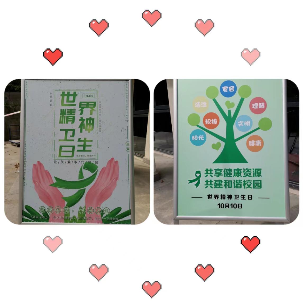 2022年10月10日是第31个精神卫生日,今年的主题是“营造良好环境,共助心理健康”。为了营造良好的育人环境,更好地帮助学生树立心理健康理念,提高心理健康意识,我校心理健康教育与咨询中心在大学生活动中心通过设计移动展架和悬挂横幅的方式进行了世界精神卫生知识的普及,旨在营造良好的心理健康环境。