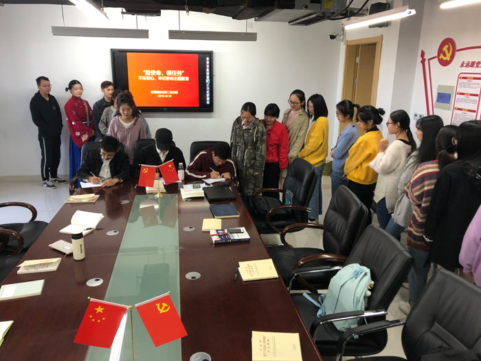 10月15日中午,新闻播音系学生第二党支部全体党员在舞蹈楼208开展“不忘初心、牢记使命”主题教育,集中学习讨论《习近平关于“不忘初心、牢记使命”论述摘编》,并组织发起学生党员“担使命、领任务”活动。会议由支部书记陈伟伟主持,系党总支组织委员张井水出席活动。