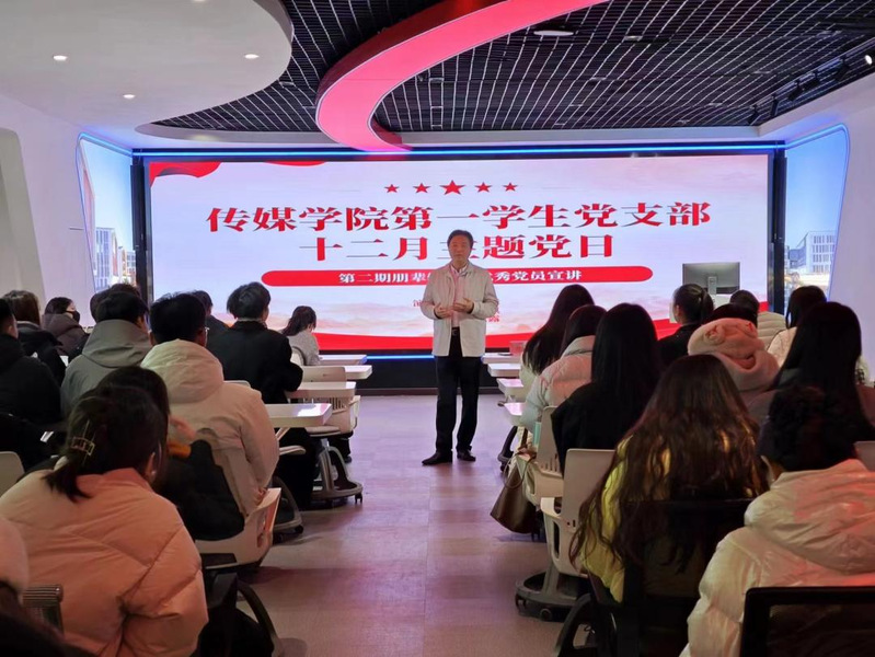 12月11日,第一学生党支部在播音楼VR党建活动室举行第二期“朋辈帮扶——优秀党员宣讲”主题党日活动,校党委委员、纪委书记、监察专员宣扬出席活动并讲话。