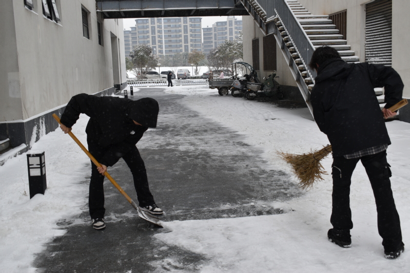 12月18日下午,为了保障同学们在雪后的出行安全,传媒学院第一学生党支部的党员们来到播音楼门口,开始了扫雪工作。