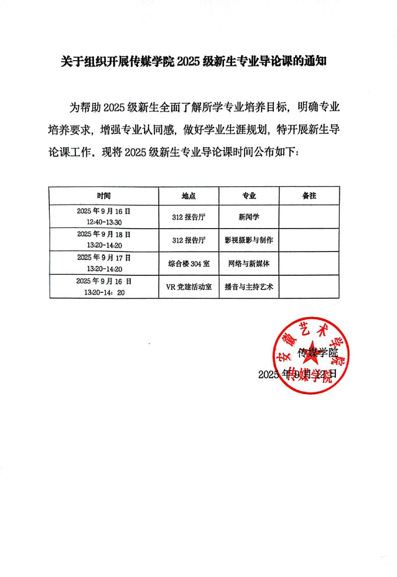 关于组织开展传媒学院2025级新生专业导论课的通知