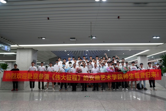 《伟大征程》由中共中央宣传部、文化和旅游部、国家广播电视总局、中央广播电视总台、中央军委政治工作部、北京市等单位主办。在这场盛大的演出中,我校派出43名师生参加。经过近百天全封闭的艰苦排练,我校师生圆满完成了其中4个节目的演出任务及电影《伟大征程》拍摄任务。参演师生本着高度的责任心、使命感,坚定的信心,严明的组织纪律,以顽强的意志克服重重困难,精益求精,展示了安徽艺术学院风采,得到了北京导演组的一致好评。7月4日,校领导周明洁、樊嘉禄及系部负责人一行专程前往合肥南站迎接赴京演出师生凯旋归来。