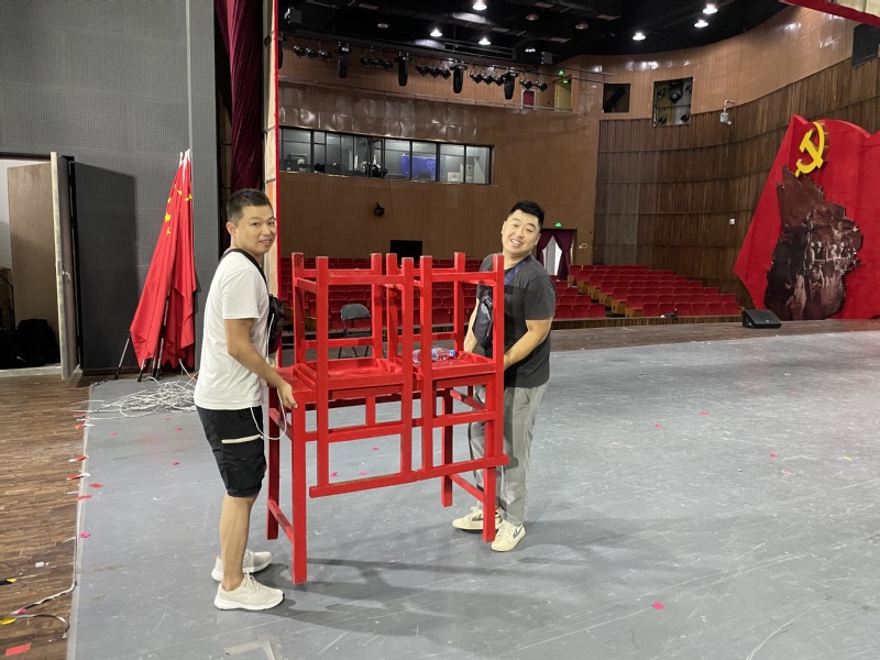 支部书记李胜、党员秦帅、王杰在小剧场开展检查检修设备是否安全运转、场内安全检查、卫生清洁和高空可疑坠落物排查工作,为全校师生做好新学期开展教学及演出活动的场馆安全保障。