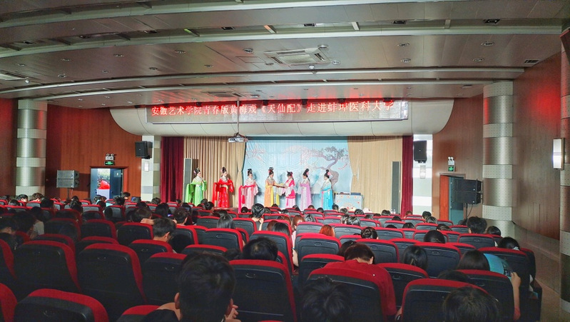 5月27日下午,我校戏剧学院青春实验剧团孵化传统戏曲复排项目黄梅戏青春版《天仙配》在蚌埠医科大学学术报告厅演出,现场200余名师生观看了演出。这次演出由安徽艺术学院和蚌埠医科大学联合主办,是我校优质文艺创作作品走出校园、扩大交流、服务社会的重要活动.