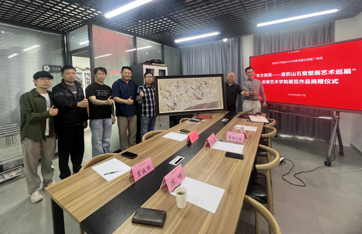 近日,国家艺术基金2024年度传播交流推广项目“东方微笑——麦积山石窟壁画艺术巡展”在校美术馆落下帷幕。麦积山石窟艺术研究所为我校美术馆捐赠壁画作品《供养飞天》,该作品由麦积山石窟艺术研究所副研究员杨晓东精心创作,承载着麦积山石窟艺术的精髓。艺术创新与实践中心为杨晓东先生颁发收藏证书。此次捐赠是校美术馆首次接受校外作品,下一步中心将与学校相关部门沟通,丰富美术馆收藏,规范艺术品资产管理。