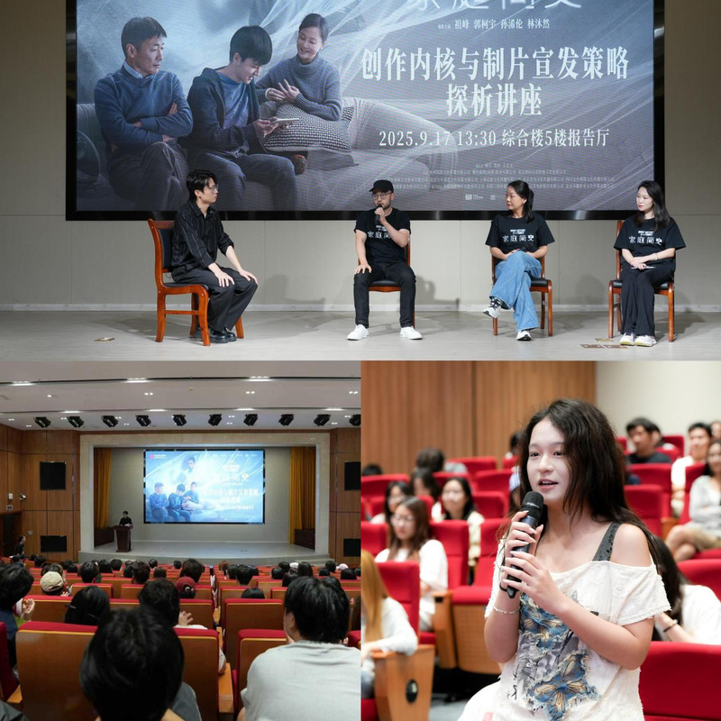 活动特别邀请了影片导演兼编剧林见捷、制片人楼莹与宣发总监冯婧璇三位主创莅临现场。嘉宾们与师生共同观影,并于观映后举行专题讲座,就影片的创作初衷、艺术手法、制片历程与宣发策略进行了多维度的解读与探讨。现场交流气氛热烈,师生提问积极,反响空前。