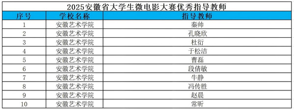 近日,由安徽省教育厅主办,安徽财经大学承办的2025年安徽省大学生微电影大赛评选结果揭晓。我校在此次比赛中表现优异,共荣获4项一等奖、2项二等奖、3项三等奖,同时有10位老师获得“优秀指导老师”称号。