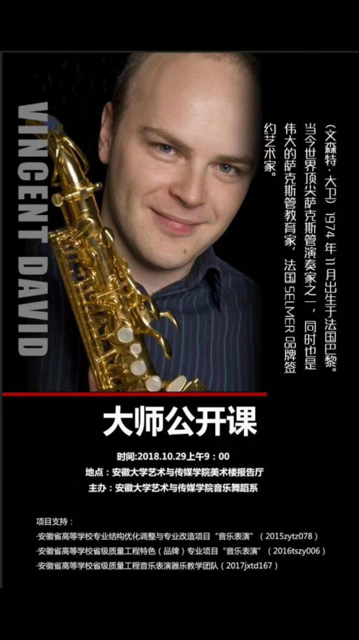 2018年10月29日,世界顶尖萨克斯管演奏家Vincent David来我院举办大师课和独奏音乐会活动,学院党委书记、院长周之虎,副院长张晶及有关部门负责人出席活动。