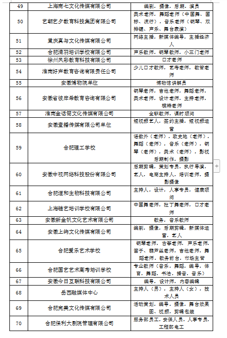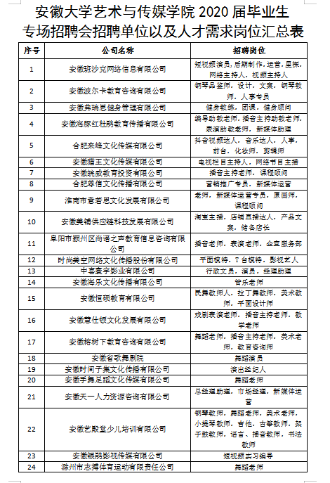 安徽大学艺术与传媒学院2020届毕业生专场招聘会招聘单位以及人才需求岗位汇总表