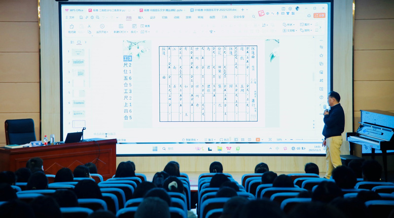 讲座内容以江南歌诗与江南美学为核心,用实例引导师生学会工尺谱识谱、唱谱,从音乐本体特征延展到江南美学。师生在互动中激发了学习传统音乐的热情与动力。