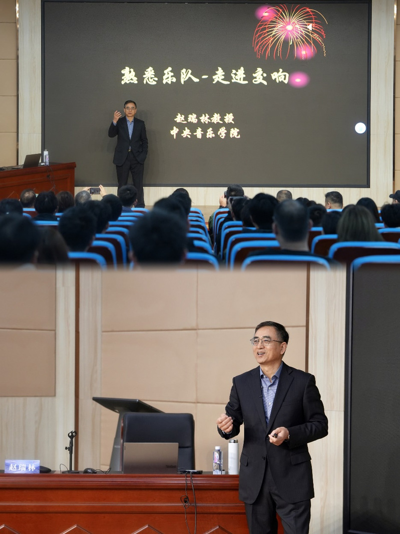 讲座中,赵瑞林细致讲解了管弦乐团与管乐团的基本构成与乐器特性。从“管弦乐团和管乐团”“管弦管乐声部编制”等方面展开,并就学院师生提问答疑解惑。