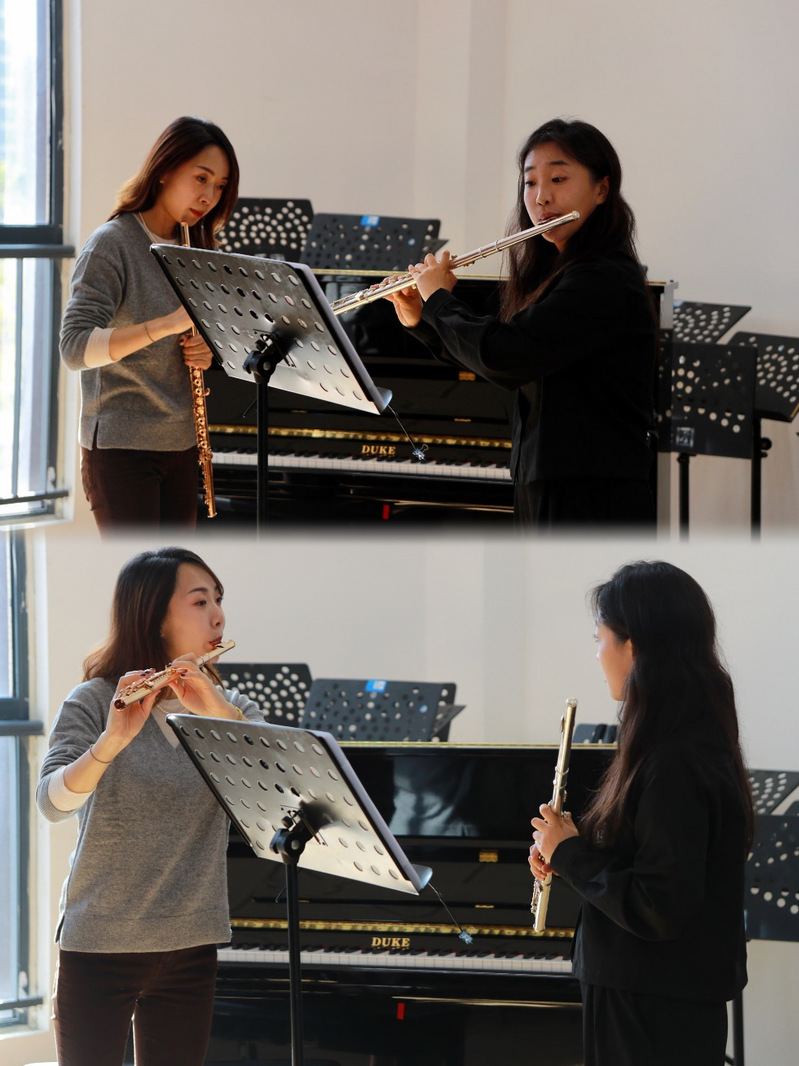 专家课上,高源老师认真聆听长笛专业的同学们演奏,指出学生们在吹奏中的错误,并对其进行示范讲解。