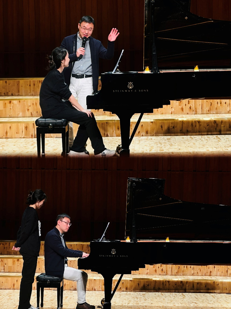 杨磊现场指导学生演奏贝多芬《D大调奏鸣曲op10.no3第一乐章》、舒伯特《c小调第19号钢琴奏鸣曲D958第一乐章》、海顿《C大调奏鸣曲Hob.XVI:50第一乐章》、李斯特《弄成》等作品。他从作品的演奏技巧、音乐表达、音乐表情处理等方面有针对性地逐一指导并示范演奏。不仅提升了学生演奏技巧,也实现了教学实践与学生表演的深度融合。