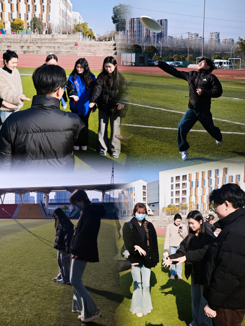第二部分活动在操场进行,围绕体育运动展开,包含飞盘、跳绳、踢毽子等项目。体育锻炼作为保持心理健康的有效途径,不仅能增强体质,还能有效缓解学习和生活中的压力。在活动中,同学们积极参与,通过团队协作与竞技互动,释放了紧张情绪,增强了集体凝聚力,进一步提升了自信心和团队精神。