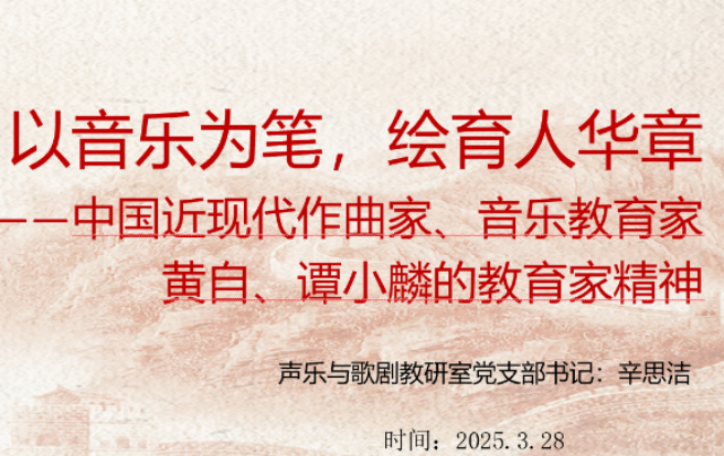 党课主题为“心有大我,至诚报国——中国近现代作曲家、音乐教育家萧友梅的教育家精神”“音乐为笔,绘育人华章——中国近现代作曲家,音乐教育家黄自、谭小麟的教育家精神”,讲述音乐教育界前辈的光辉事迹,阐述教育家精神在他们身上的具体表现。通过对教育家精神的具体解读,帮助教研室党支部全体党员深入理解教育家精神内涵,为当下教育工作提供借鉴。(撰稿:朱临吉 初审:辛思洁 复审:陈凤梅 终审:郭强)