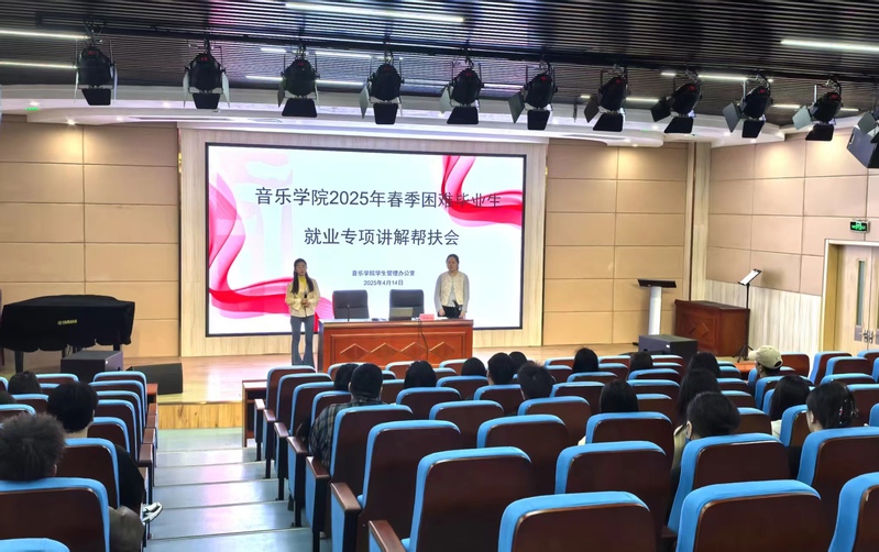 (一)精准帮扶:困难毕业生就业专项讲解会。4月14日,音乐学院在学院一楼报告厅召开2025届春季困难毕业生就业专项讲解帮扶会。辅导员张珂、胡玥和班主任谢潘婕围绕就业政策、岗位推荐等内容进行针对性指导,帮助困难毕业生明确职业规划。