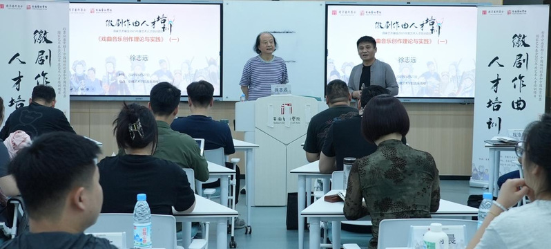 6月27日上午,在安徽艺术学院崇德楼智慧教室,著名黄梅戏作曲家、安徽国乐研究院院长徐志远讲授《戏曲音乐创作理论与实践》(一)。