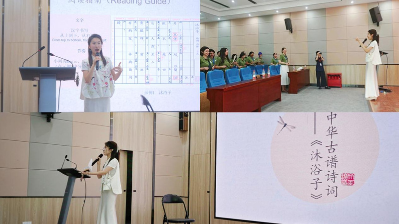 2025年7月4日,中华古谱诗词传承与创新研究中心研究人员谢潘婕博士应邀赴安徽大学国际教育学院北楼报告厅,参加安徽大学2025年“汉语桥”外国学生夏令营活动。为来自智利、白俄罗斯和阿塞拜疆的50多名国际学生教授“中华古谱诗词课程”,引领他们深入体验古谱诗词的独特魅力。
