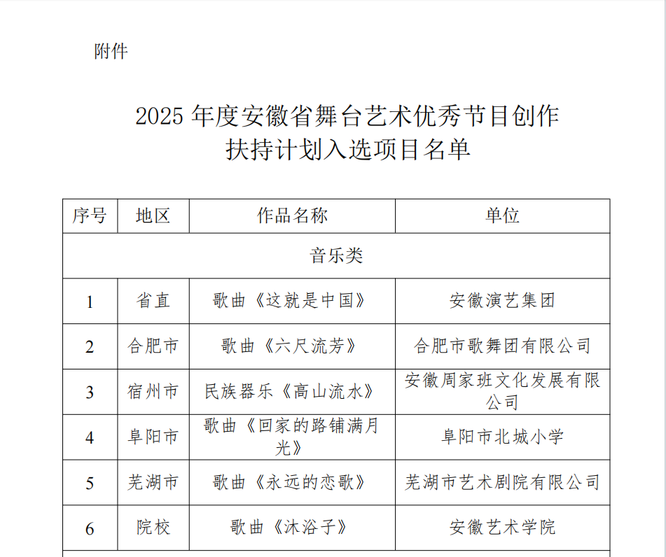 此次评选活动根据《关于开展2025年度安徽省舞台艺术优秀节目创作扶持计划的通知》要求,经过各地推荐、专家评审及公示环节,最终16 个作品(含音乐类、舞蹈类、曲艺杂技类、选题类)从众多优秀作品中脱颖而出。我校以深厚的艺术底蕴和创新精神,在音乐创作领域展现强劲实力。