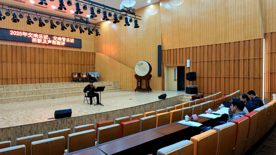 10月15日,安徽艺术学院交响乐团与交响管乐团2025年度招新与团员考核在音乐南楼音乐厅顺利举行。本次考核特邀安徽省音乐家协会副主席、国家一级指挥周晓平,以及安徽艺术学院客座教授、小号演奏家顾平,与本院交响乐团指挥丁凡、管乐团团长张纪辰共同组成权威评审团,对参选学生的专业素养与艺术潜力进行了全面评估。