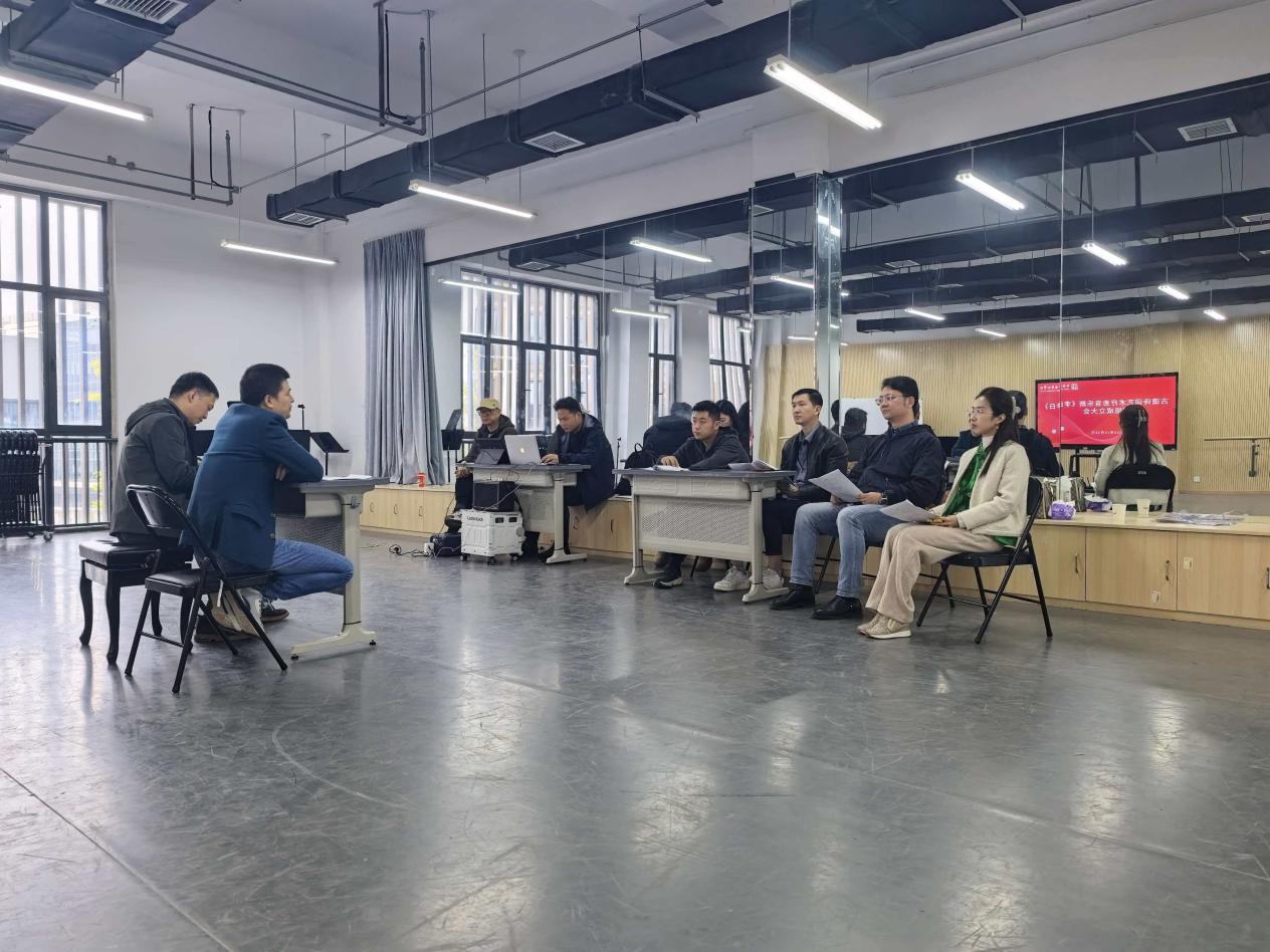 2025年10月26日下午,马鞍山艺术剧院委托安徽艺术学院的横向课题项目——古谱诗词艺术疗愈音乐剧《李白》(暂定名)剧组成立大会,在安徽艺术学院音乐南楼隆重召开。项目负责人张祖顺(饰演李白)、导演杨高猛、编剧冯传胜、音乐总监赵化彬等剧目主创成员,曹磊(饰演唐明皇)、秦帅(饰演高力士)、张研(饰演李龟年)、谢潘婕(饰演杨贵妃)等主要演员,以及部分舞蹈演员和剧组工作人员共同参会。