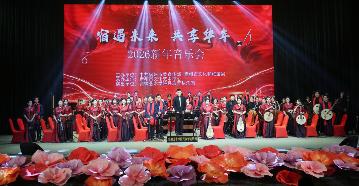律回春晖,万象更新。2025年12月30日晚19:00,由中共宿州市委宣传部、宿州市文化和旅游局主办,宿州市文化艺术中心承办的“宿遇未来 共享华年”2026新年音乐会在宿州市文化艺术中心大剧院华彩上演。我院民族管弦乐团作为演出单位,以一场高水准、充满真挚情感的民乐盛宴,与现场八百余名社会各界观众共迎新年,奏响了祝福宿州、展望未来的华美乐章。