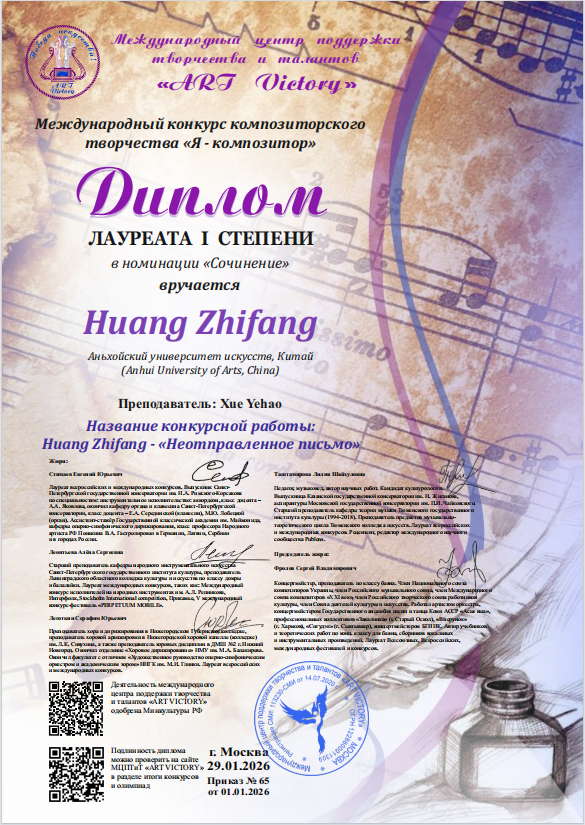 近日,我校音乐学院2023级作曲与作曲技术理论专业学生黄志方凭借钢琴独奏作品《未寄出的信》,在2025俄罗斯国际“作曲家”作曲大赛中脱颖而出,荣获作曲组一等奖,专业课教师薛业浩、钢琴艺术指导教师叶晓涵分别荣获优秀指导教师奖。