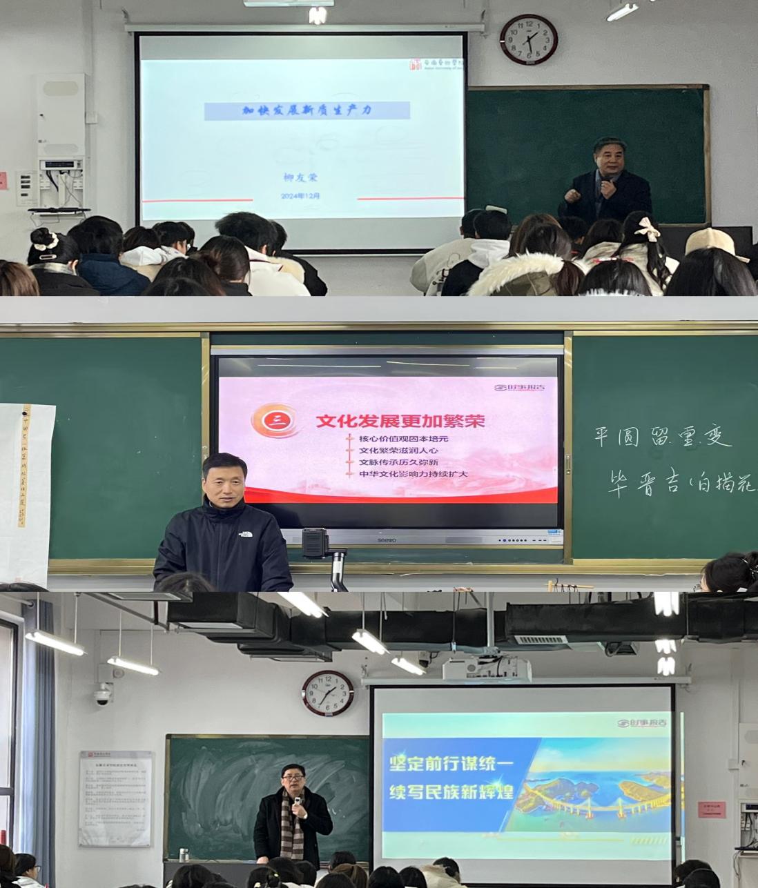 校党委委员、副校长柳友荣,党委委员、副校长陈林,党委委员、纪委书记程宗林分别走进戏剧学院、美术学院和传媒学院,以“加快发展新质生产力”“七十五载迎盛世 砥砺前行续华章”“坚定前行谋统一 续写民族新辉煌”为主题,用创新的理论、严谨的逻辑、生动的语言、鲜活的事例,为广大学子带来一场场富有思想性、理论性和亲和力的思政课,受到广大学子欢迎。课上,他们旁征博引、深入浅出,深入分析当前国际国内形势,将理论与实践紧密结合,引起同学们强烈共鸣。